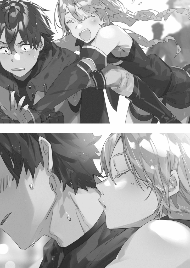 “‘Nempel’? Hei, kalau ngomong begitu orang bisa salah paham, tahu nggak?! Lagian, emang pernah kau nempel ke Haruhiro kayak gitu sebelumnya?!”