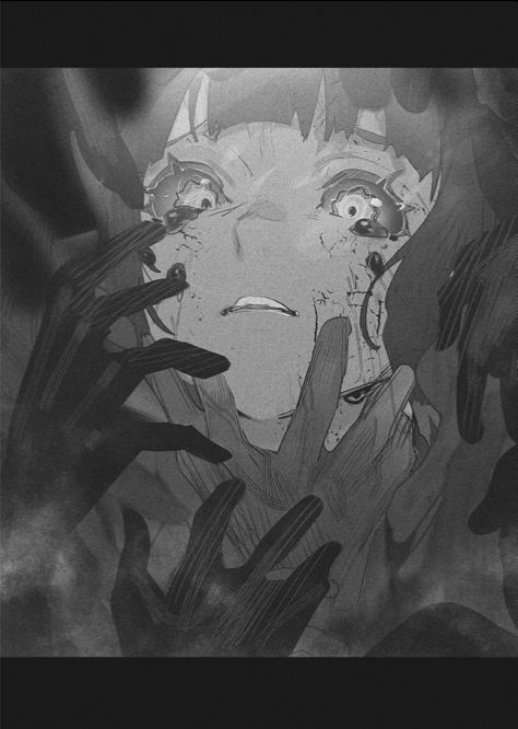 Tangan, mungkin? Tangan hitam. Banyak sekali tangan. Manato berpikir begitu karena di ujung setiap lengan hitam itu ada tangan, seperti tangan manusia dengan lima jari. Setiap lengan hitam tampak memiliki tangan di ujungnya. Ribuan lengan hitam yang terhimpun bersama. Namun ada satu bagian yang tidak seperti lengan. Di bagian atas, agak ke tengah, dikelilingi oleh tangan-tangan hitam itu, terlihat sesuatu yang putih muncul di celah-celahnya.