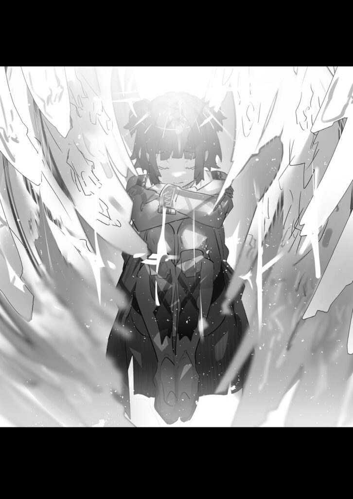 Ah, aku—Cheriel, Saint of Cherished Devotion—diselimuti oleh sayap-sayap cemerlang, berlapis-lapis, mengelilingiku dalam pelukan cahaya.