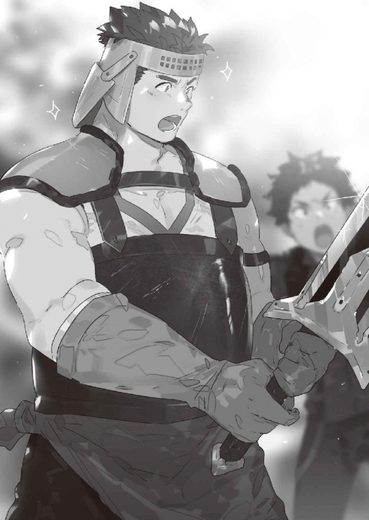 “Kamu bilang apa?! Moguzo, sini, kasih ke aku!” Ranta merebut pedang besar itu dari tangan Moguzo—namun, “Gwuh?!” ia langsung menjatuhkannya.
