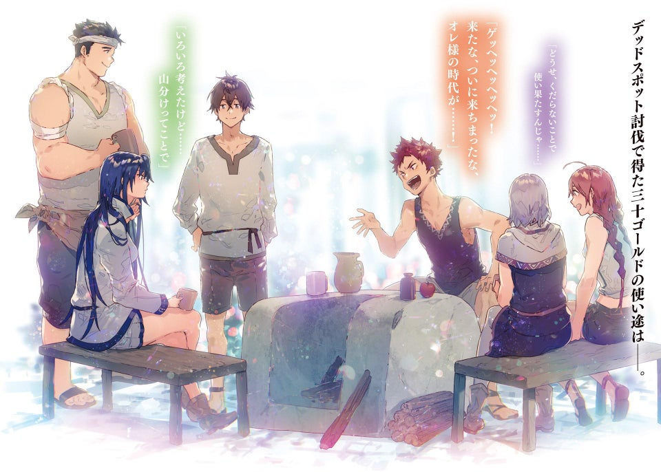 Tiba-tiba, Ranta merangkul bahu Haruhiro dan Moguzo, lalu tertawa dengan gaya mesum yang keterlaluan.